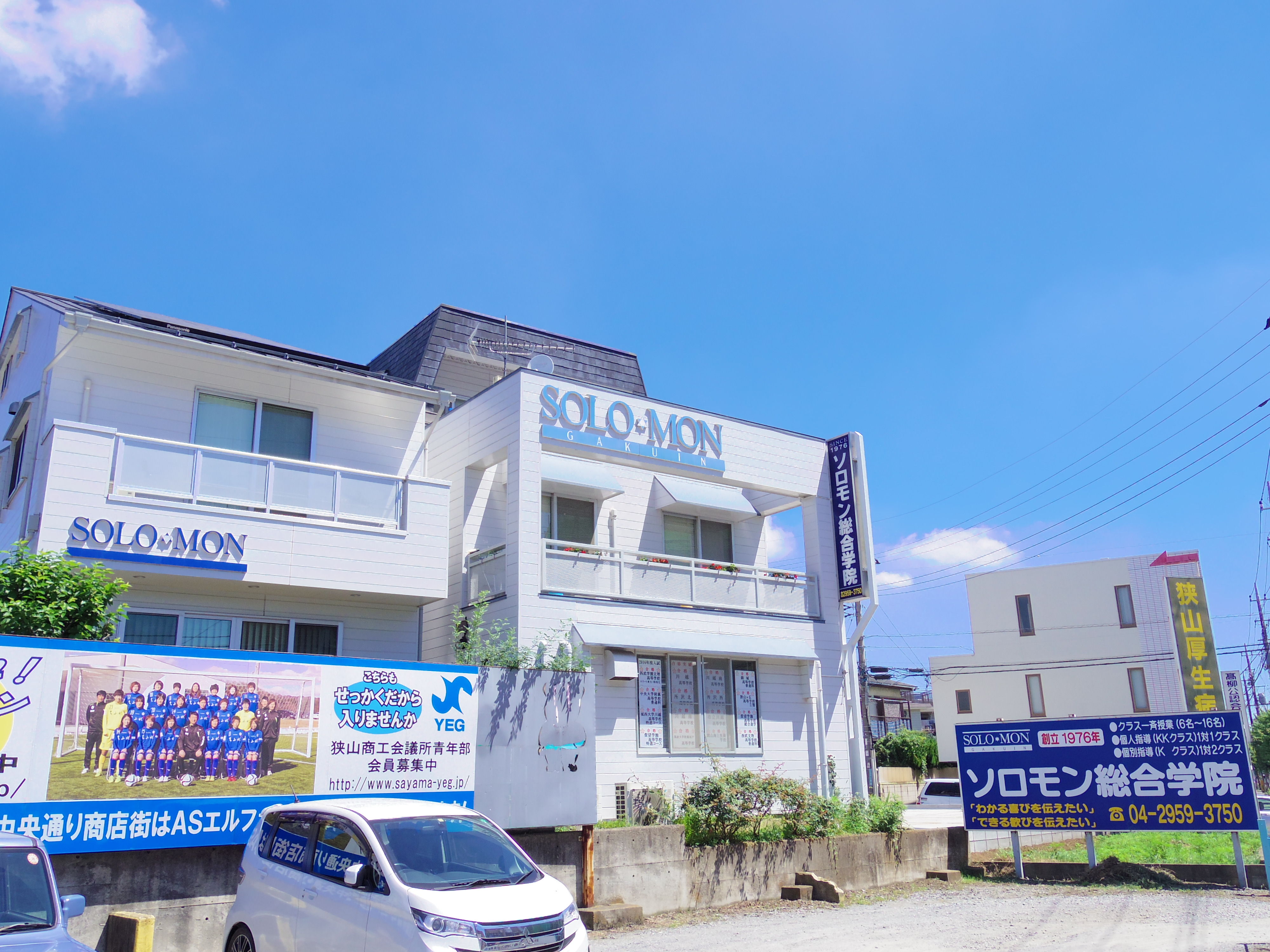 狭山市駅東口から祇園白山神社の方に進みます。狭山郵便局まで直進後、冨士見1丁目交差点を左折ヤマダ電気を右側に見ながら直進すると、すき家、コスモ石油、埼玉トヨペットの前を順に通過しソロモン総合学院の看板を左折